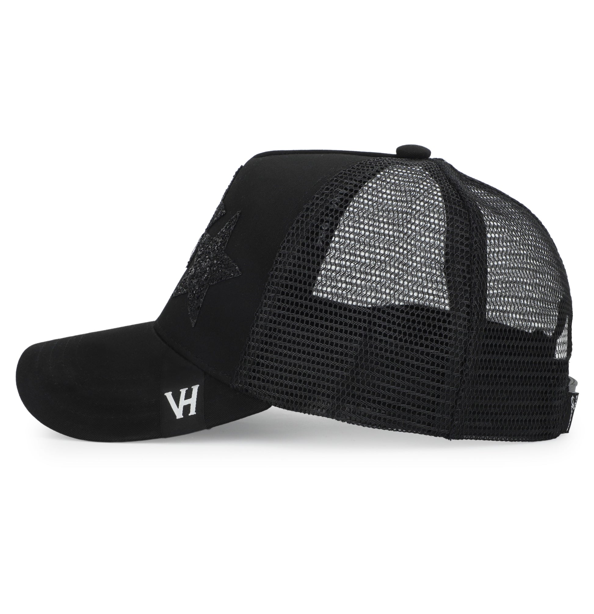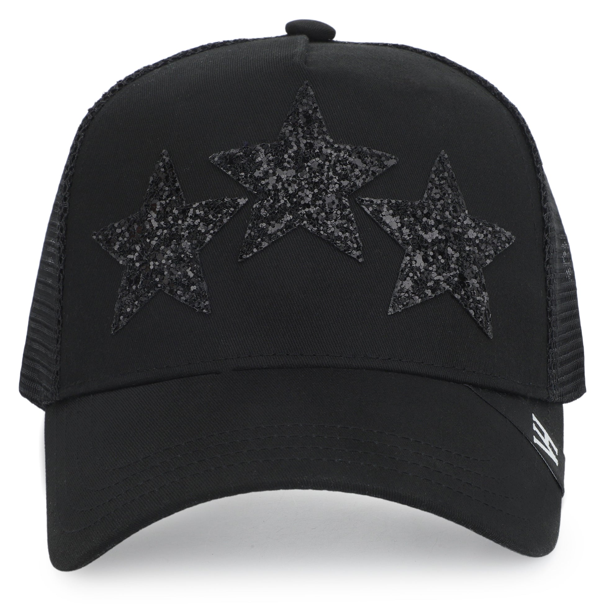 - Trucker Hats by Vintage Havana: Combining sleek with a touch of sparkle, our sun hat offers a perfect blend of elegance and dazzle. Adorned with 3 Black glitter stars our beach hat adds a glamorous touch to any outfit.