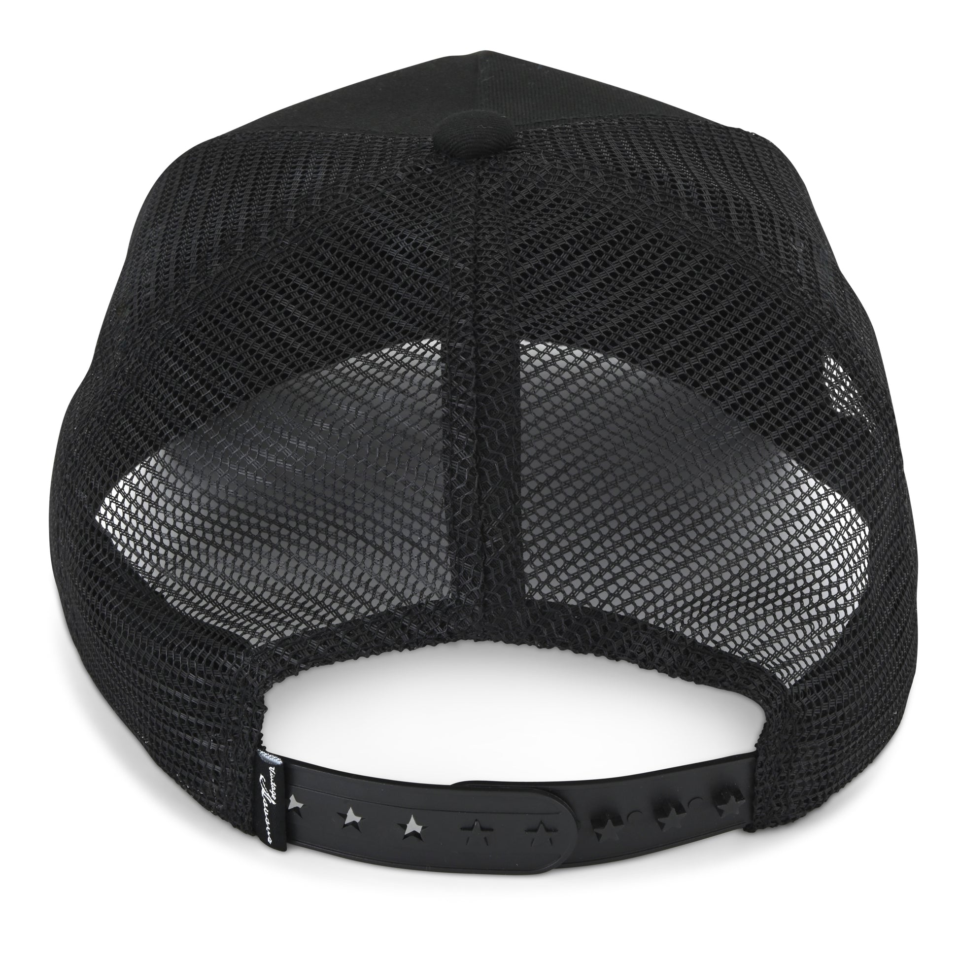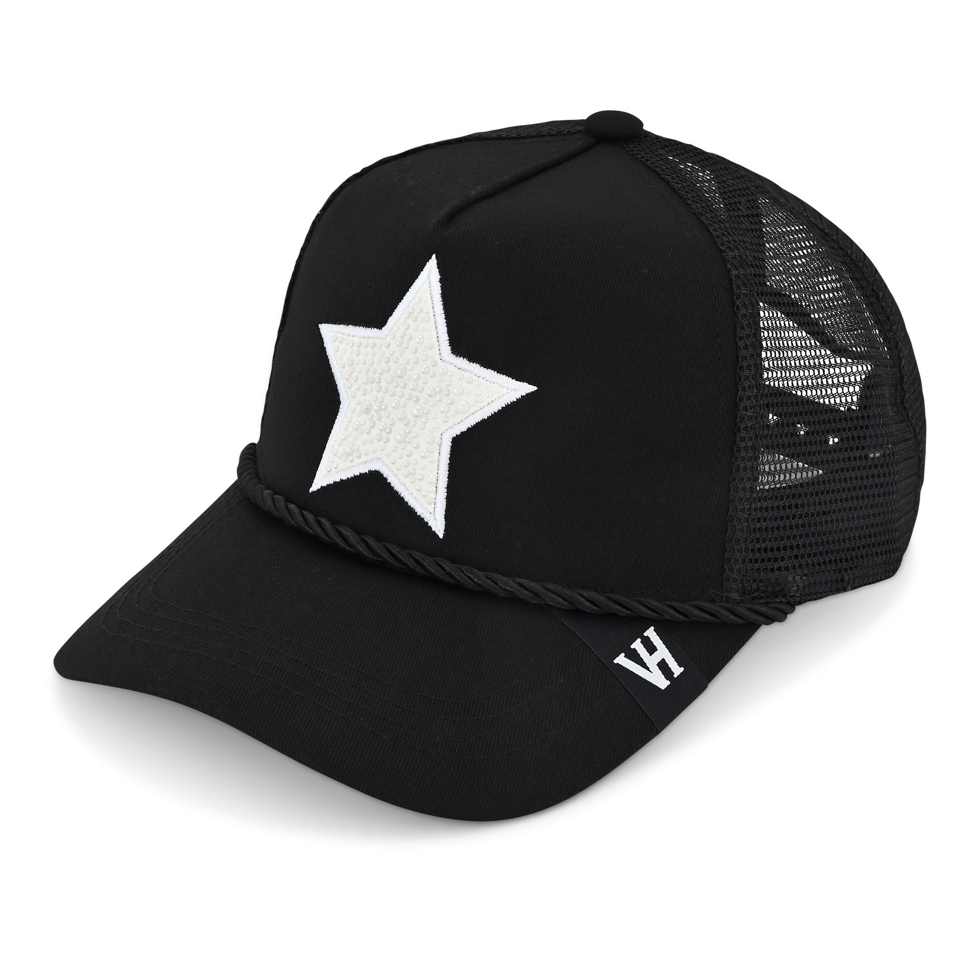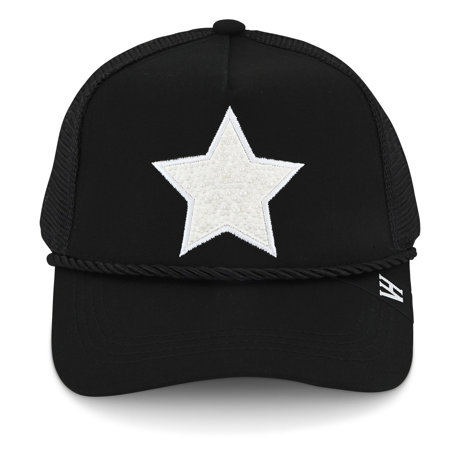 - Stand Out in Style with our Black Trucker Hat featuring a captivating white star embellished with pearls. The hat's distinct charm lies in its attention-grabbing visor adorned with a unique rope design, adding a touch of flair to the classic trucker style. Make a statement with our one-of-a-kind Trucker Hat that effortlessly combines glamour, individuality, and comfort.