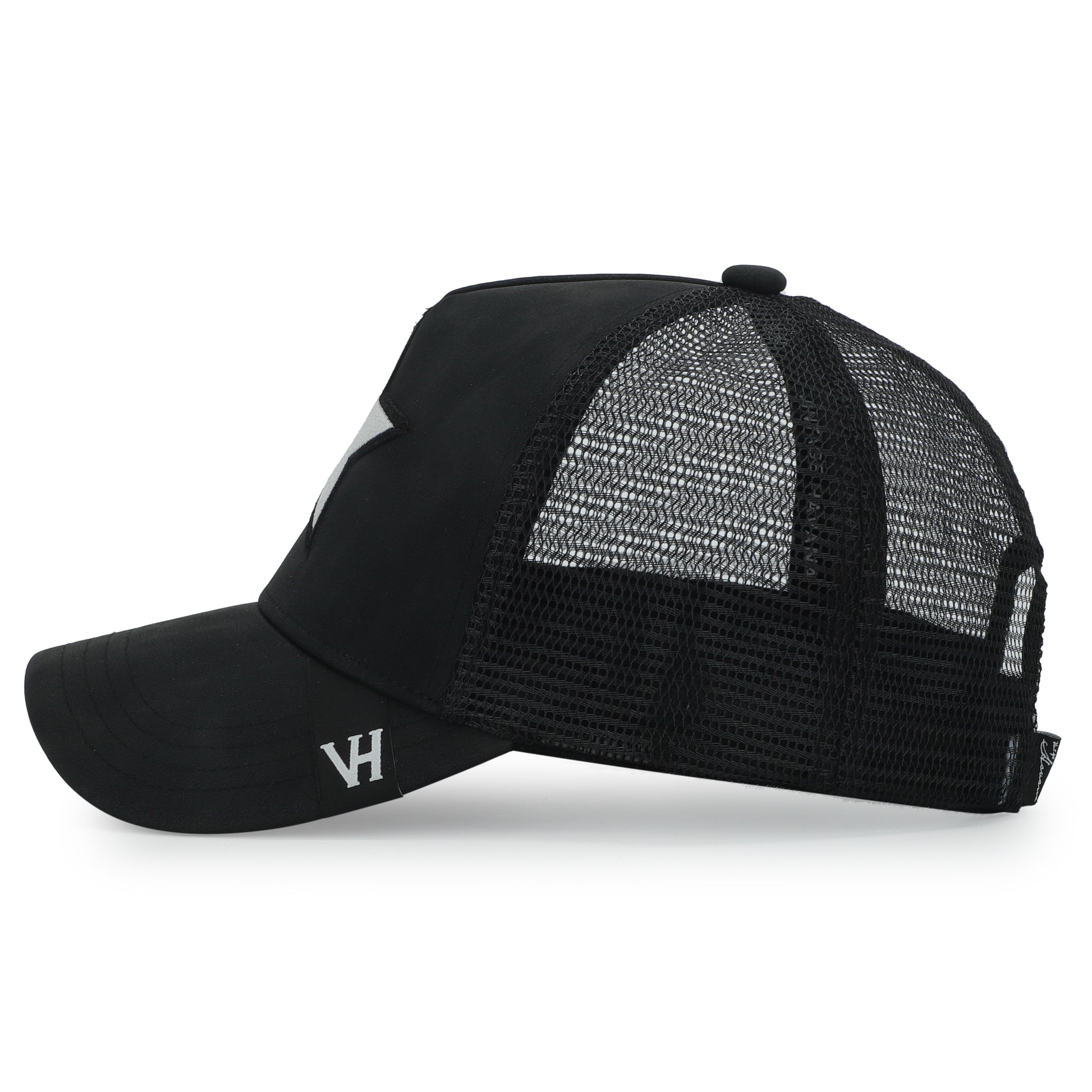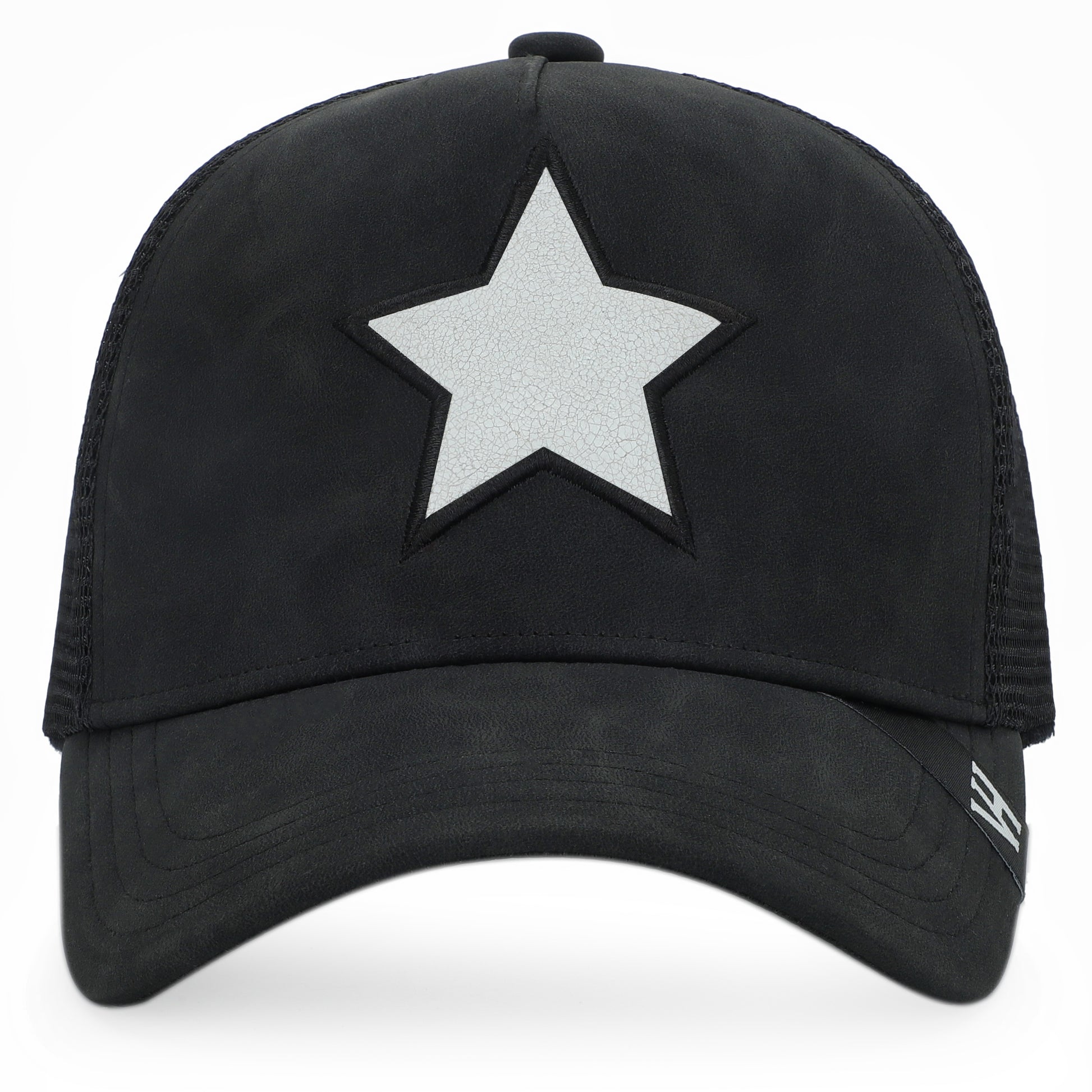 - Stand out in style with our Synthetic leather Black Trucker Hat, featuring a captivating white cracked leather star. The hat's distinct charm lies in its attention-grabbing cracked leather star design, adding a touch of flair to the classic trucker style. Make a statement with our one-of-a-kind Trucker Hat that effortlessly combines glamour, individuality, and comfort.
